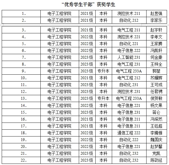 包括2021级到2023级多个专业的员工获得“优秀员工干部”称号,如测控技术与仪器、自动化、电气工程、电子信息、通信工程、人工智能等专业的员工,这些员工在班级和公司管理中发挥的积极作用。